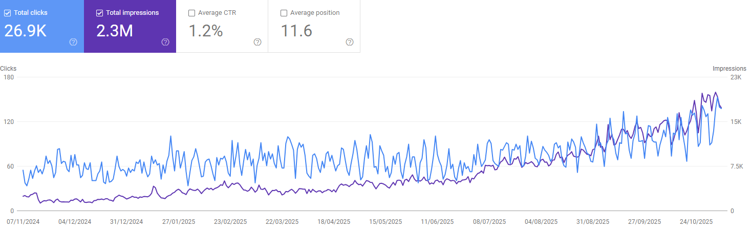 1) Our SEO performance grew exponentially, reaching 2.3M impressions and 26.9K clicks, with a stable upward trajectory and a 5–6× increase in organic traffic within a single year.