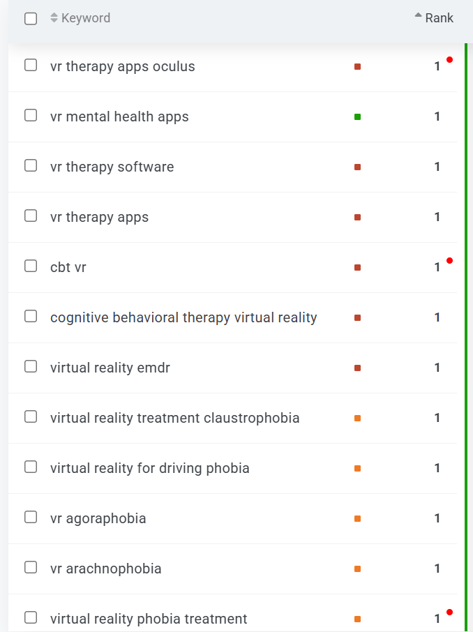 Within the first months of systematic work, we scaled the project’s inbound pipeline from roughly 25 incoming leads per month to 180+ monthly leads, including clinics, private therapists, universities and governments entities. Our website now ranks in the top positions for high-intent keywords related to VR therapy, exposure therapy, phobia treatment in VR, and immersive mental health therapy.